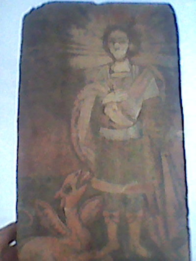 Продам старинную икону, возможно она была частью церковного иконостаса. Написана на дереве. Старая. От времени выцвела. с обратной стороны немного повреждена насекомыми(шашель). На иконе изображен св. Георгий Победоносец, который стоит на лапе змея. |