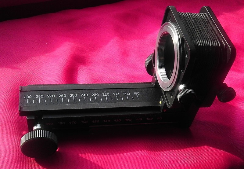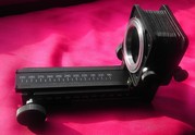 Продам Фото-приставку для макросьемки ПЗФ. В отличном состоянии. Мех целый . Приставка ПЗФ предназначена для макросъемки мелких объектов в различном масштабе. Представляет собой мех двойного растяжения с плавной настройкой расстояния при помощи реечного механизма. Салазки снизу имеют две резьбы под крепежный винт на 1/4" и 3/8" для установки приставки в штатив или струбцину. Резьбовые адаптеры на обеих сторонах регулируемые, что позволяет крепить аппарат в любом положении. То-есть в отличии от макро колец имеем станок для макросъемки со всеми опциями - плавное изменения масштаба съемки, поворот кадра в любое положение, регулируемое крепление установки к штативу. Может быть использована с любыми аппаратами при помощи адаптеров.Почти не использовалась.